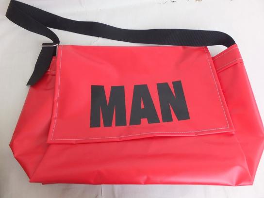 PVC素材で仕上げた、大きなMANのプリントが目を惹くメッセンジャーバッグです。