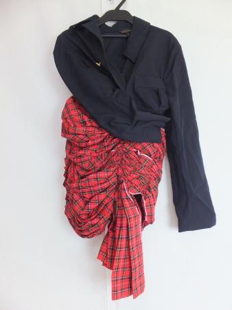 綿素材の生地に赤のタータンチェック柄ウール生地を合わせ、ドッキングワンピースのようなアイテムになります。