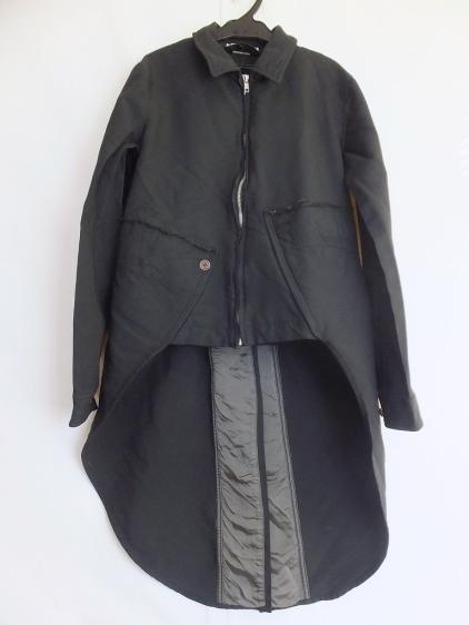 燕尾服のように前丈は短く、後丈が長くなっているデザインです。燕尾ジャケットと聞きますとエレガント、フォーマルなイメージがございますが、この商品はフルジップを使用、特殊加工を施し、シワ等の風合いを出しカジュアル感を引き立てている1着です。
