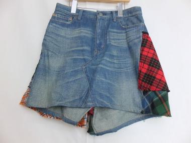 異素材チェック柄を接ぎ合わせたデニムスカート。後ろにボリュームを持たせた可愛らしい1着です。
