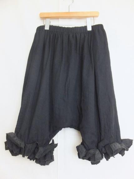 裾にフリルがついたサルエルパンツ。さらさら肌触りのポリエステル素材で製品洗い加工を施し、独特な