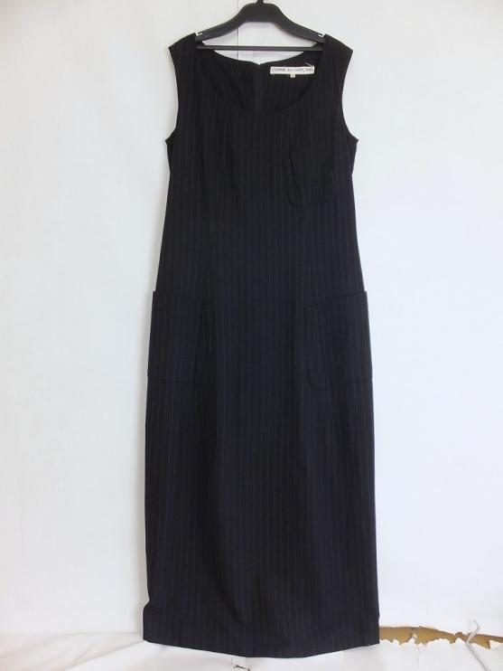 ウール100%のストライプ柄、ノースリーブロングワンピースになります。後ろにはスリットが入っており、女性らしいシルエットとなっております。フォーマルなど幅広くお使いなれる1枚です。
