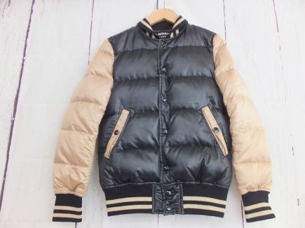 ダウン、フェザーが入ったスタジャンデザインのブルゾンです。ブラックとベージュの2色使いなのでコーデしやすく幅広くお使いになれるカッコよい1着です。