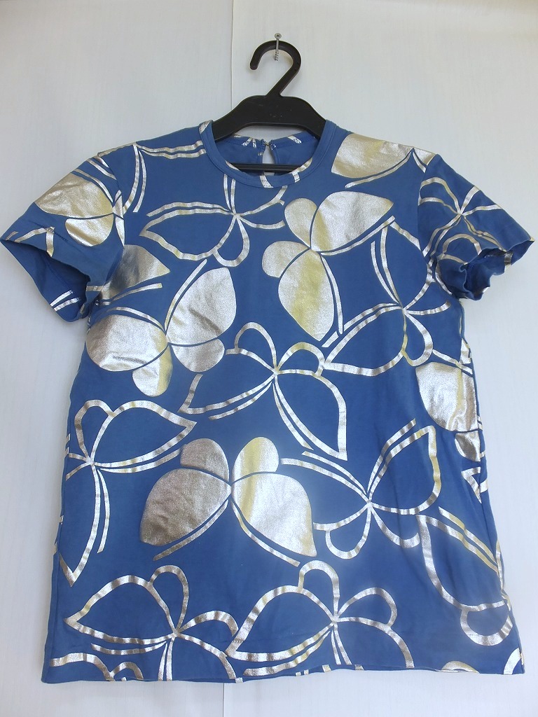 蝶柄の箔プリント加工が施してあるTシャツです。箔プリントの柄が、キラリとリッチに輝くTシャツです。